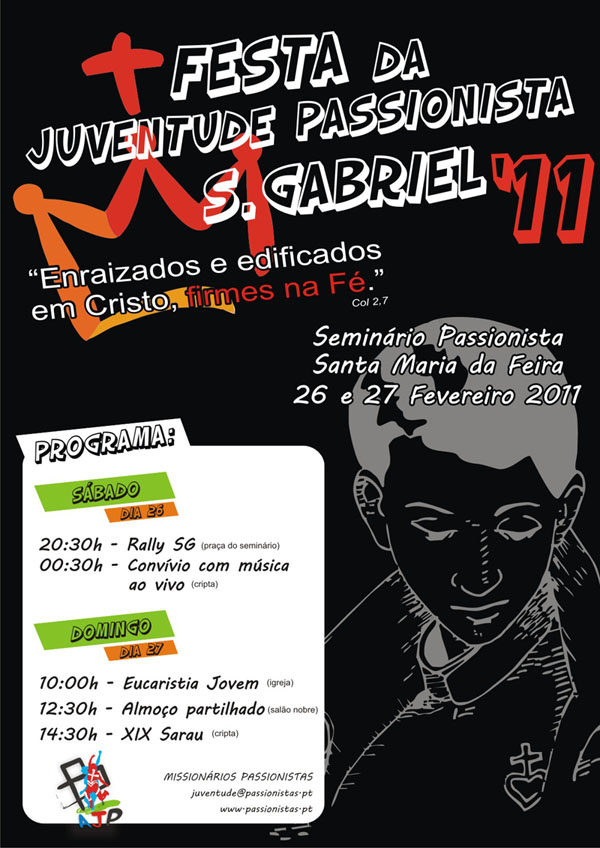 A Festa da Juventude Passionista – S. Gabriel ’11, realizar-se-á, mais uma vez, como já vem sendo tradição, no Seminário Passionista de Santa Maria da Feira, nos dia 26 e 27 de Fevereiro.