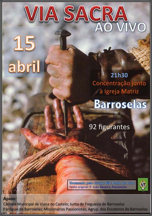 À semelhança do que já se tem feito em anos anteriores com a “Entrada Triunfal de Jesus em Jerusalém – na ‘cidade humana'”, o Grupo S. Paulo realizará pela primeira vez este ano a encenação ao vivo da “Via-Sacra”, partindo do texto original do passionista P. João Bezerra. Esta peça, pelas ruas da vila de Barroselas, terá lugar no dia 15 de Abril, com início na igreja matriz de Barroselas às 21.30h, e contará com a participação de quase 100 personagens.